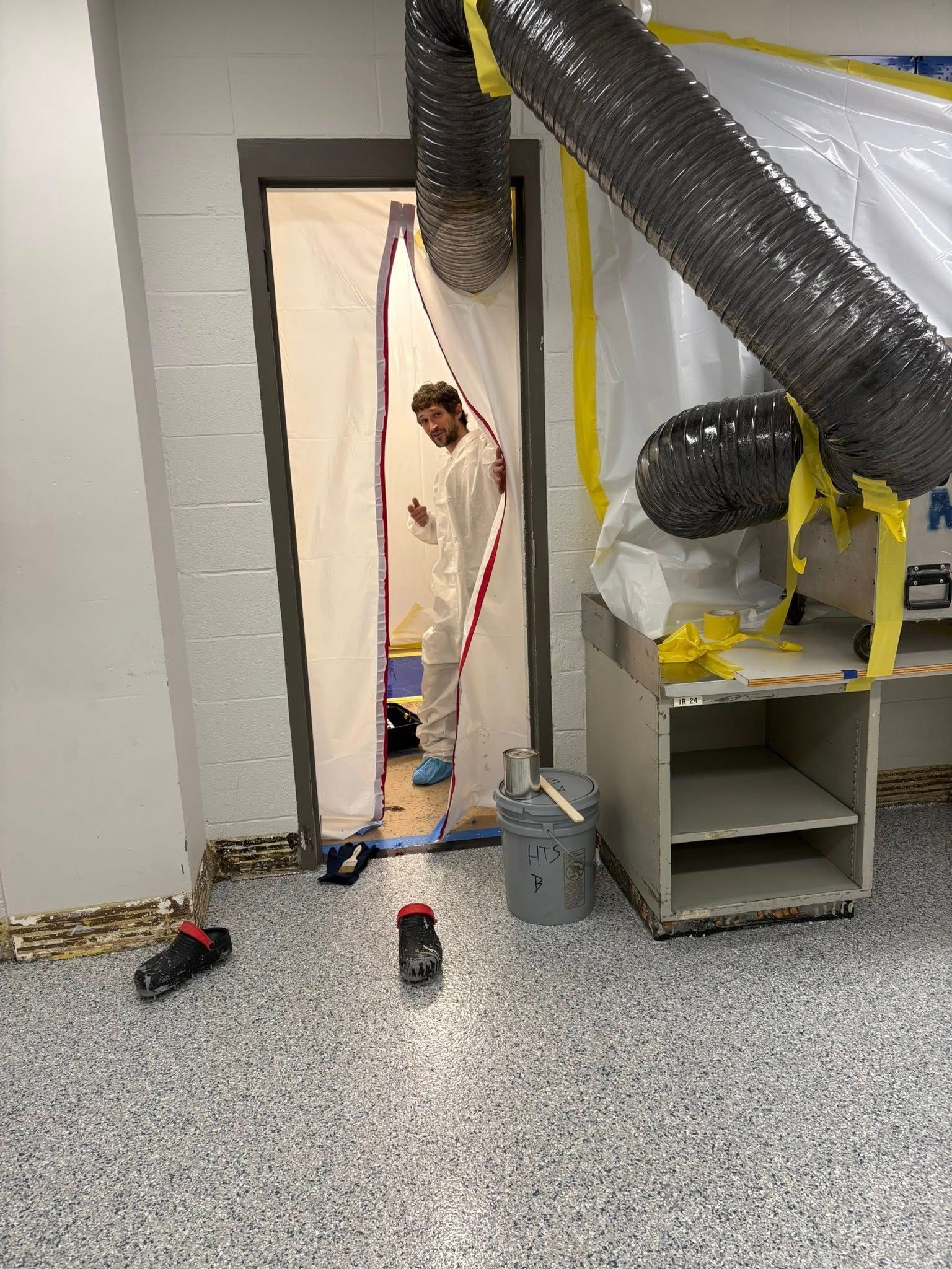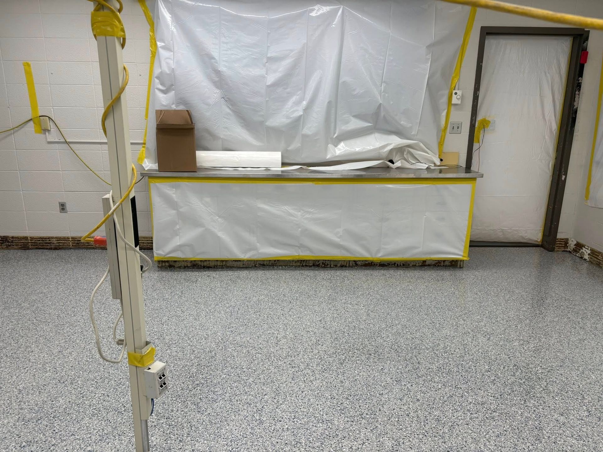 Working alongside Sam Melaragno to handle logistics and build out the ICRA protocols was an absolute blessing. His coordination kept the project running smoothly while maintaining the highest standards of infection control in this critical sterile environment. To match AHN’s branding, we incorporated custom broadcast flakes in their signature colors for a clean, professional appearance. We then locked everything in with a 100% solids antimicrobial epoxy grout coat, followed by an aluminum oxide-filled urethane topcoat. The finished floor offers exceptional durability, outstanding chemical resistance, and easy cleaning — all essential for a sterile healthcare environment.