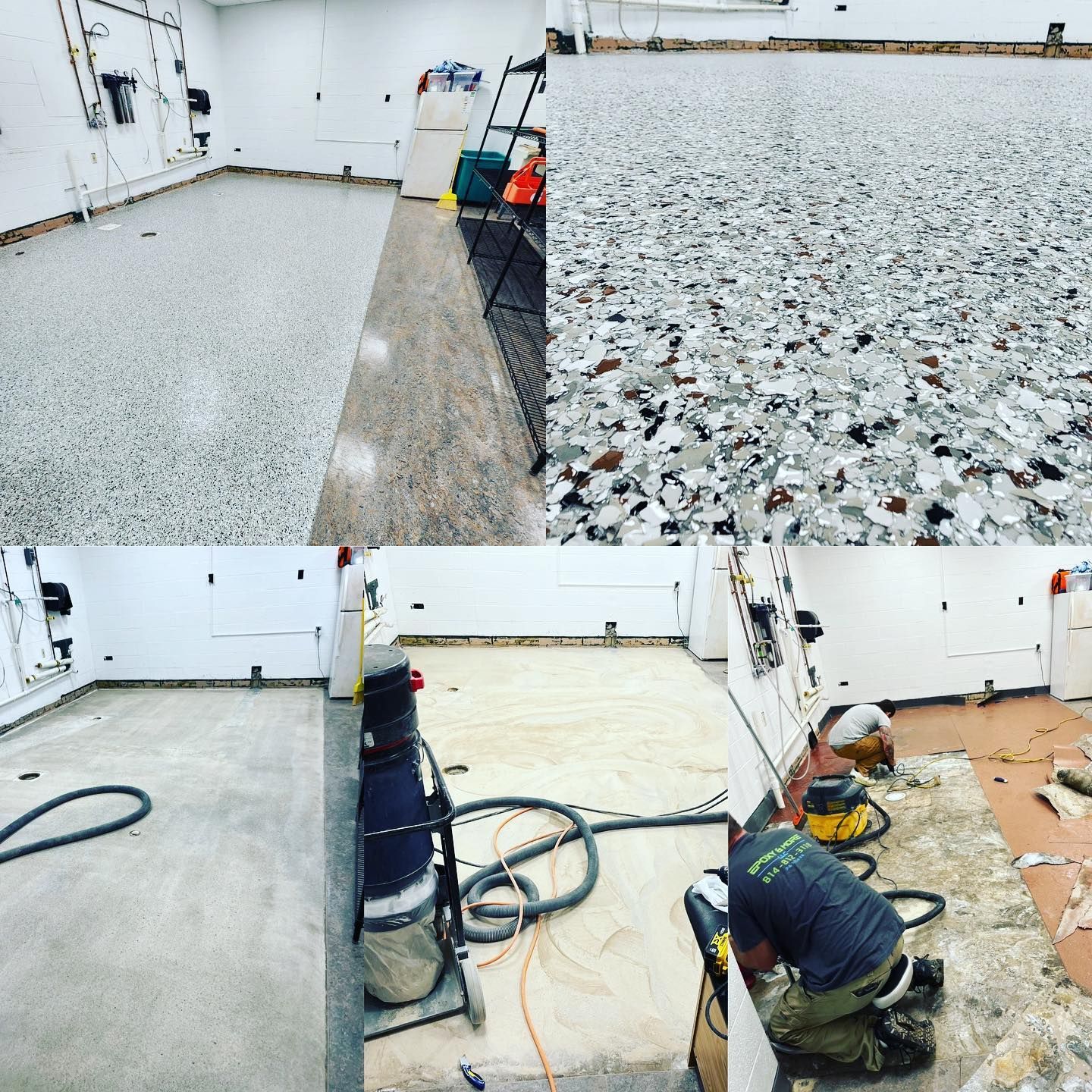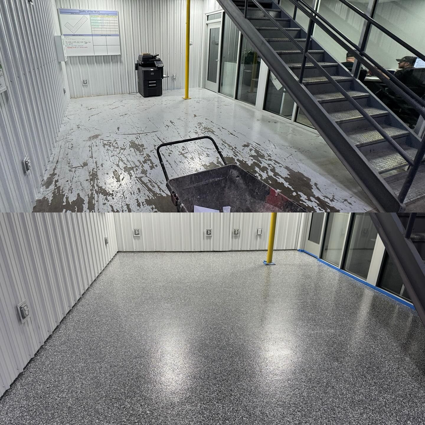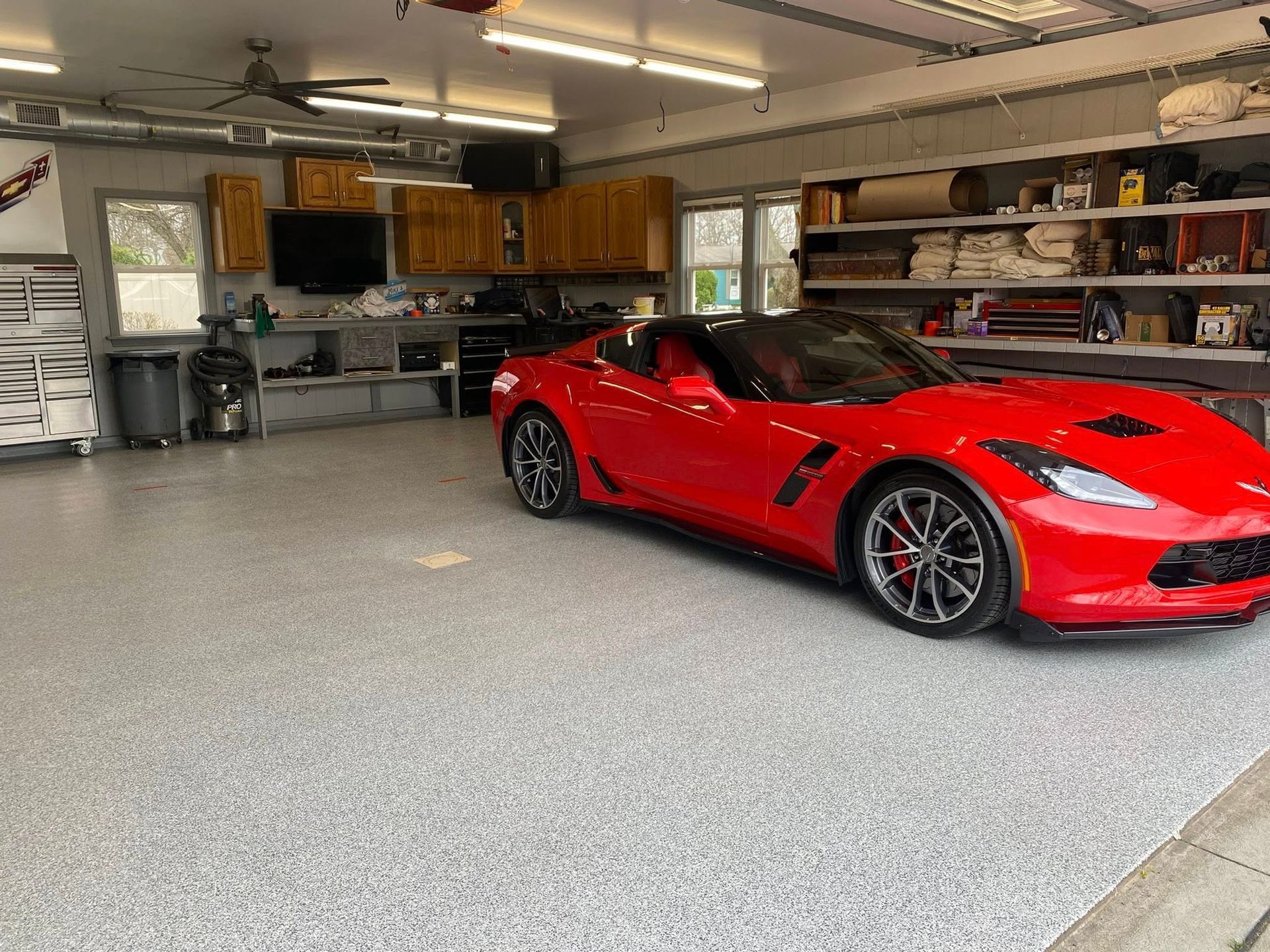 On top of that goes a flake broadcast wall-to-wall, sealed with a polyaspartic topcoat (with polypropylene) that's tough enough to handle hot tires, oil, chemicals, and daily abuse. The result is a floor that looks great, cleans easily, and is built to last for years.
