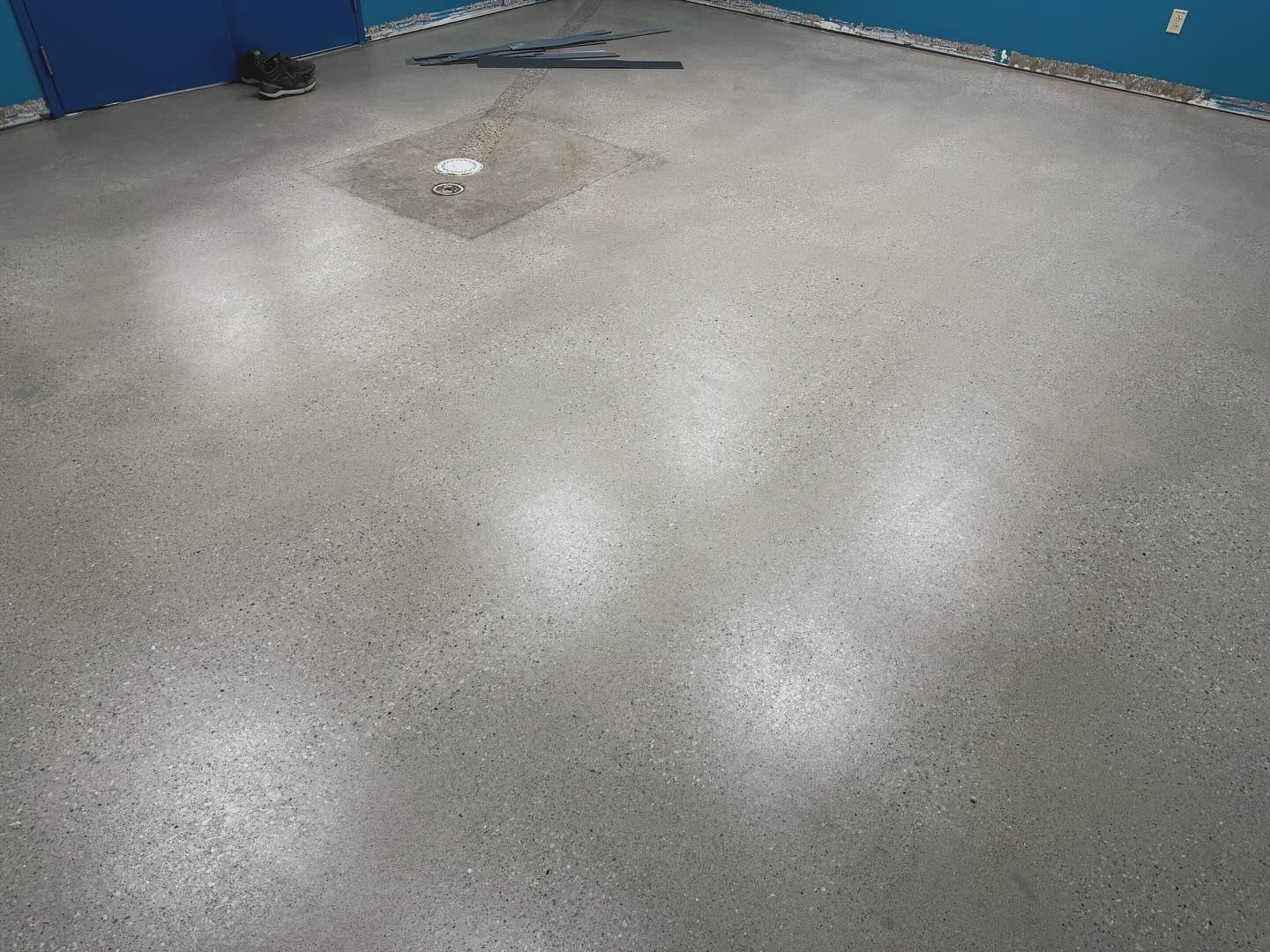 applied topical sealer/coating (not from mechanically polishing the concrete to ultra-fine grits like true polished concrete does). This gives a similar bright, exposed-aggregate appearance at a fraction of the cost and time—but because it's a coating on top of the concrete, it will wear down sooner than a standard/true polished floor (where the finish is inherent to the densified slab itself and requires almost no reapplication). With that said, you’ll still get